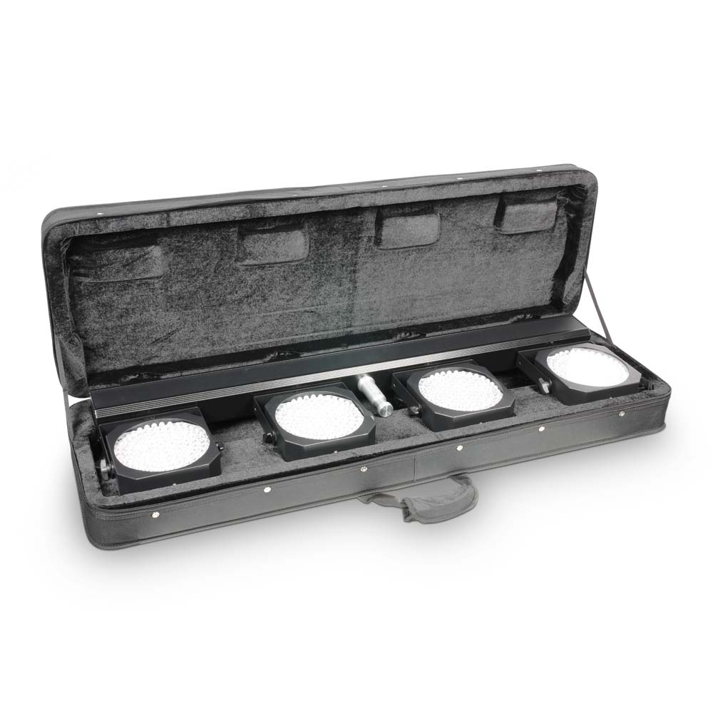 - Lysbom med fire stk LED flatkanner, 432 x 10 mm LED pærer, dvs 144 pærer av hver farge; blå, rød og grønn.